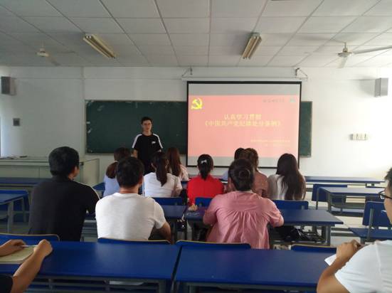 9月19日上午,自然人文研究生党支部全体成员在学院实验楼201教室集体学习新修订的《中国共产党纪律处分条例》,本次学习会由自然人文研究生党支部书记解进飞主持并领学。