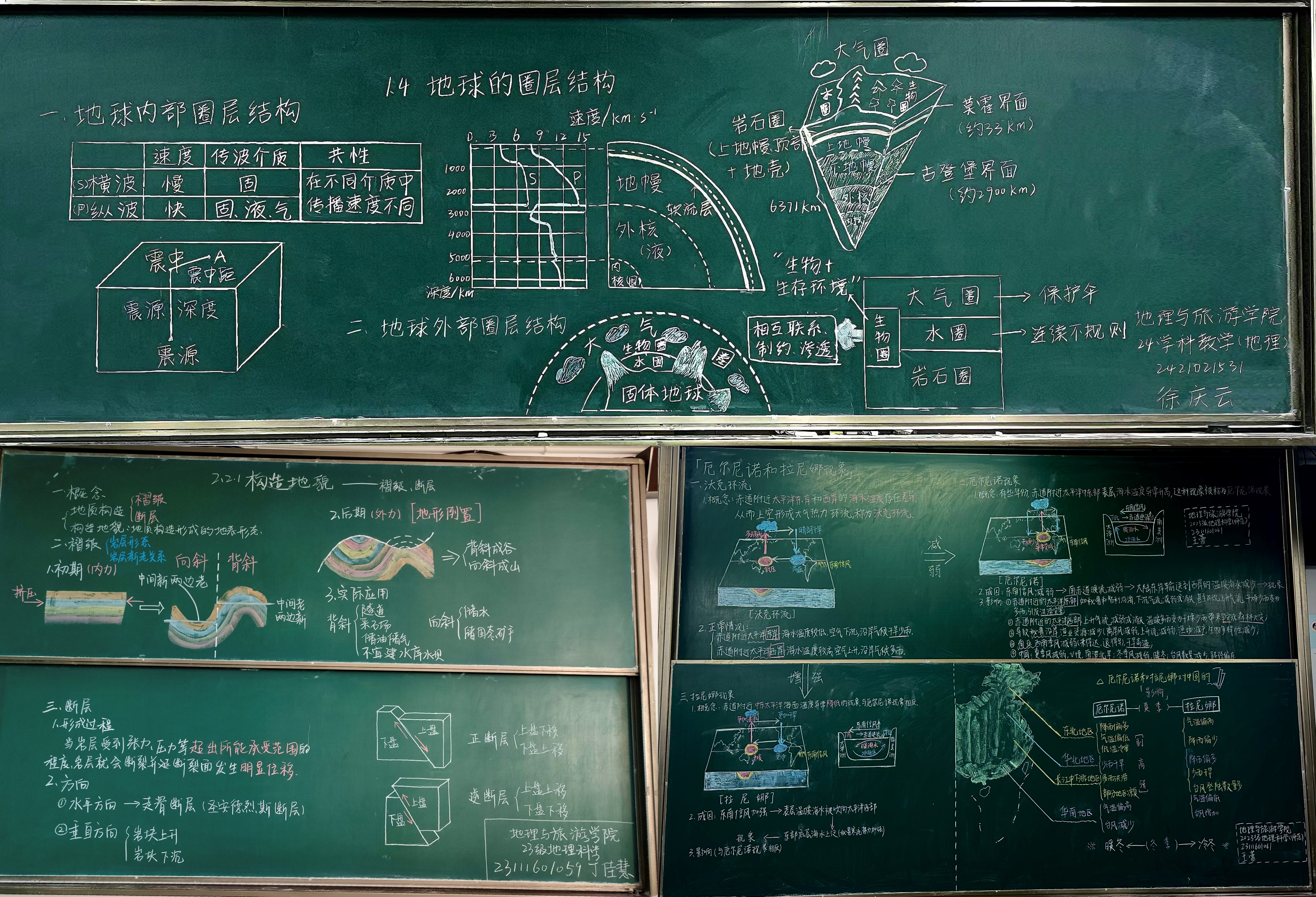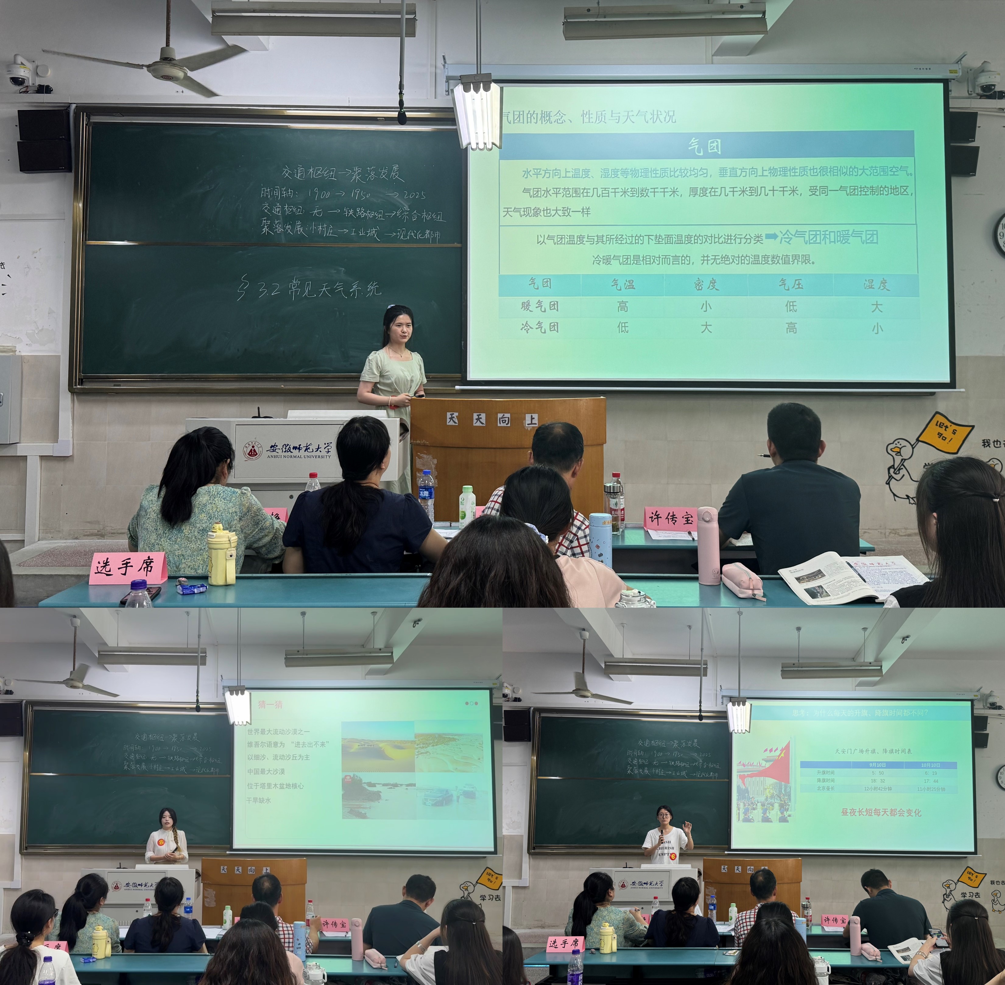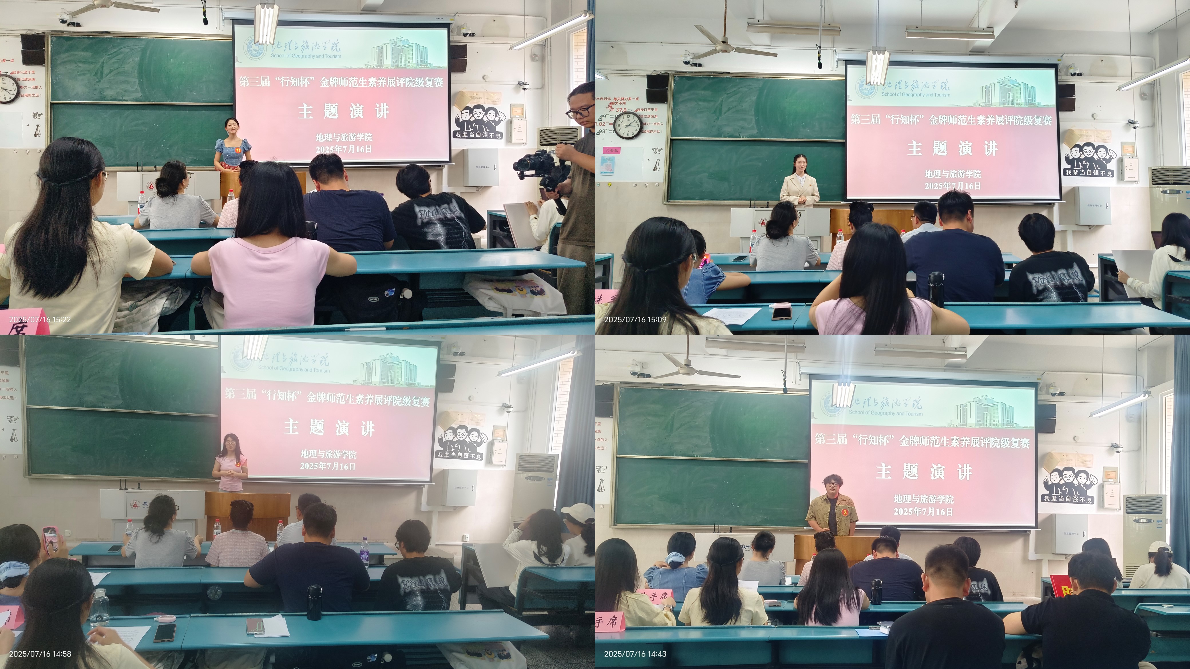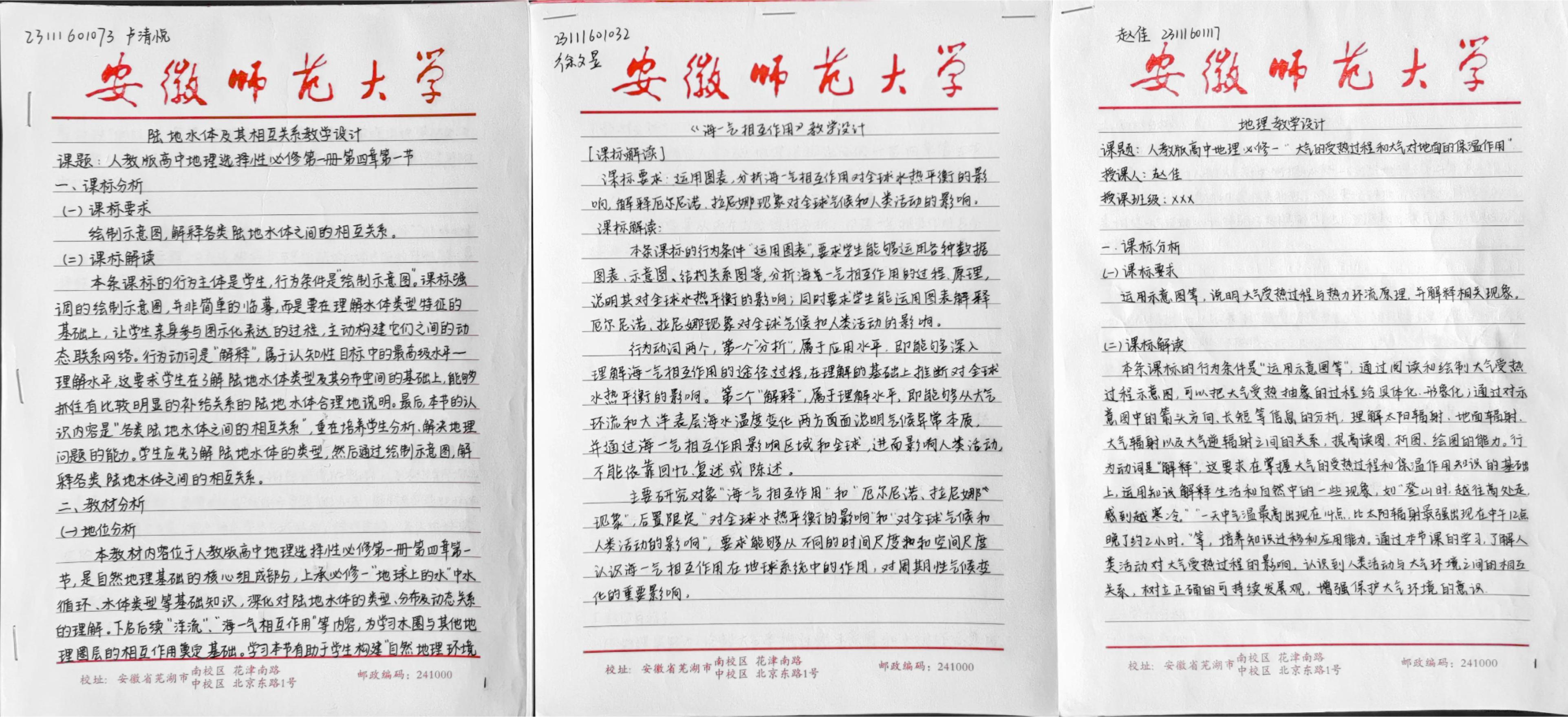 现场各位评委还对教学板书和教学教案进行了评选。同学们根据比赛要求,以教材为载体,积极适应基础教育课程改革新理念、新要求,设计了高质量的教学板书和教学教案。2023级地理科学(优师)专业的秦岭同学在备赛过程中,不断练习粉笔字书写,从字体的美观到板书内容的逻辑呈现,反复琢磨。他说:“作为地理师范生,我深刻体会到板书不仅是写字画画,更是‘空间思维’的直观表达。 一笔一画勾勒山川河流、标注气候分区时,就是在脑海中构建、梳理地理格局。练习中让我明白,如何用最简洁的板图板画,把抽象的地理概念‘立’在黑板上,成为学生理解世界的清晰窗口。”