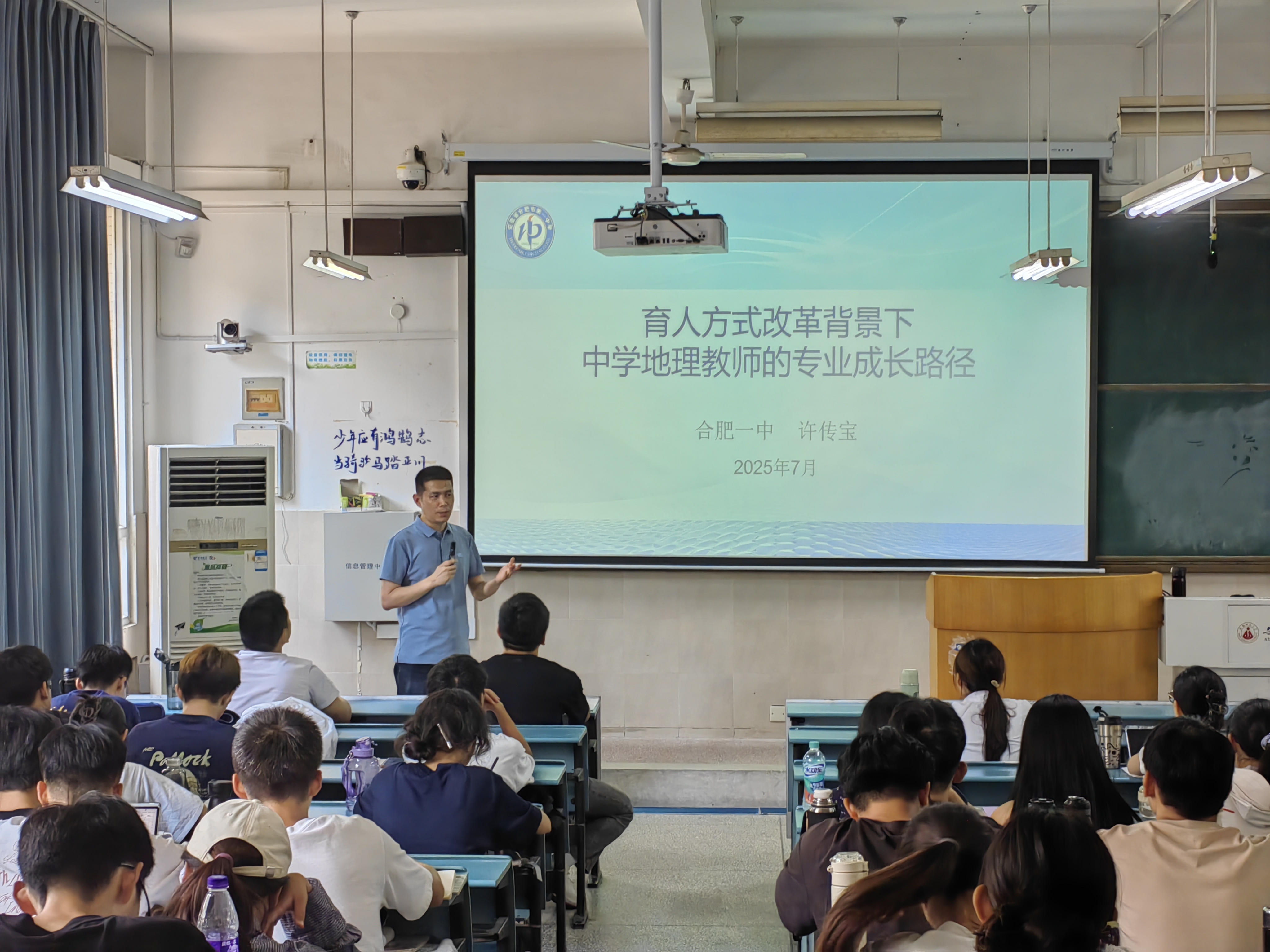 7月9日下午,安徽省骨干教师培训专家、中学地理高级教师、合肥一中地理学科主任许传宝应邀为暑期小学期师生开展专题讲座。他围绕“育人方式改革背景下中学地理教师专业成长路径探析”这一主题,从“坚定理想信念,涵养师德师风”“提高专业素养,夯实育人根基”“转变教学方式,提高育人水平”“强化地理实践,变革育人方式”“推进地学竞赛,拓展育人途径”等方面,结合自身职业发展经历和教学实践经验,全面论述了新高考、新课标、新教材等教育改革背景下地理教师专业成长路径。