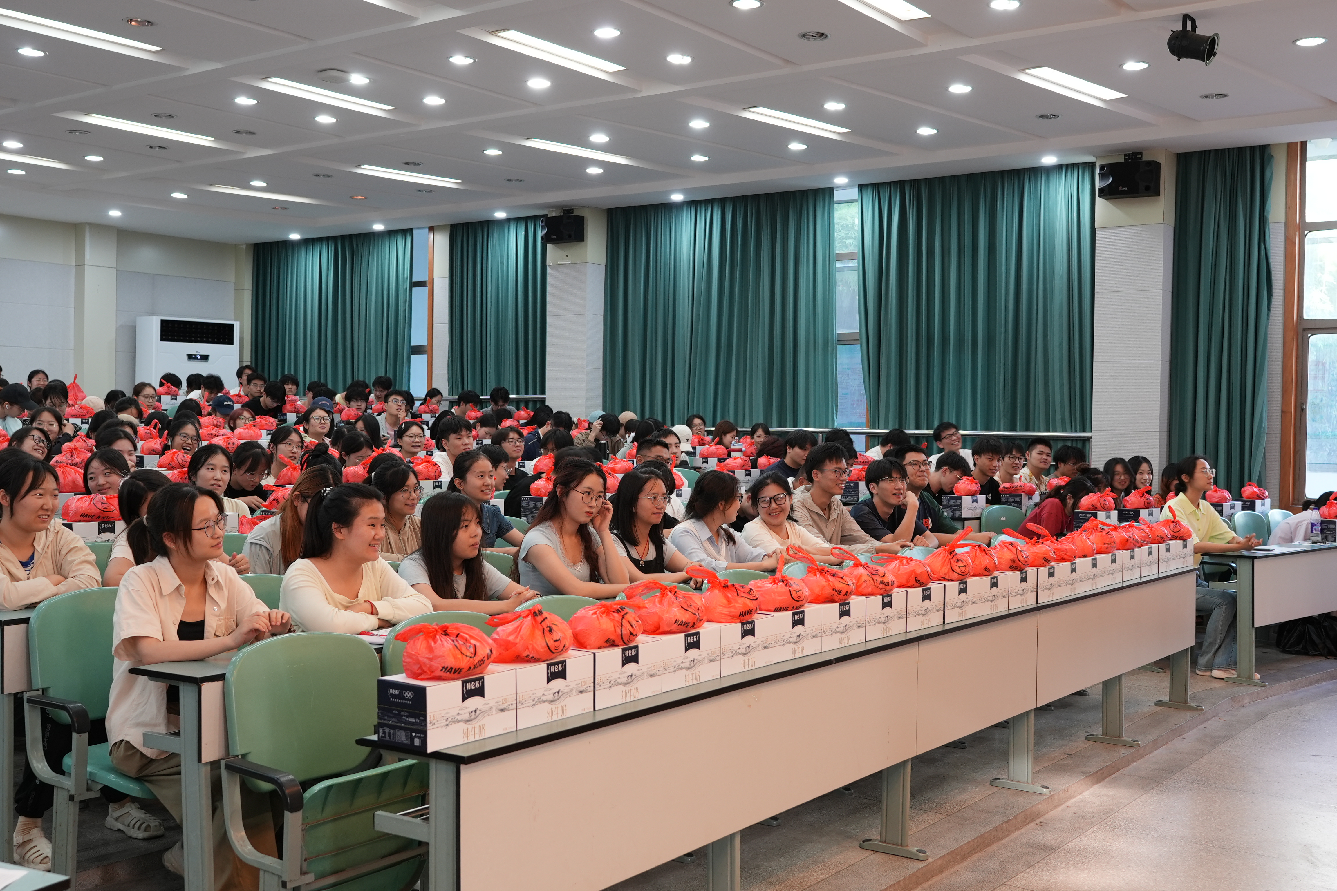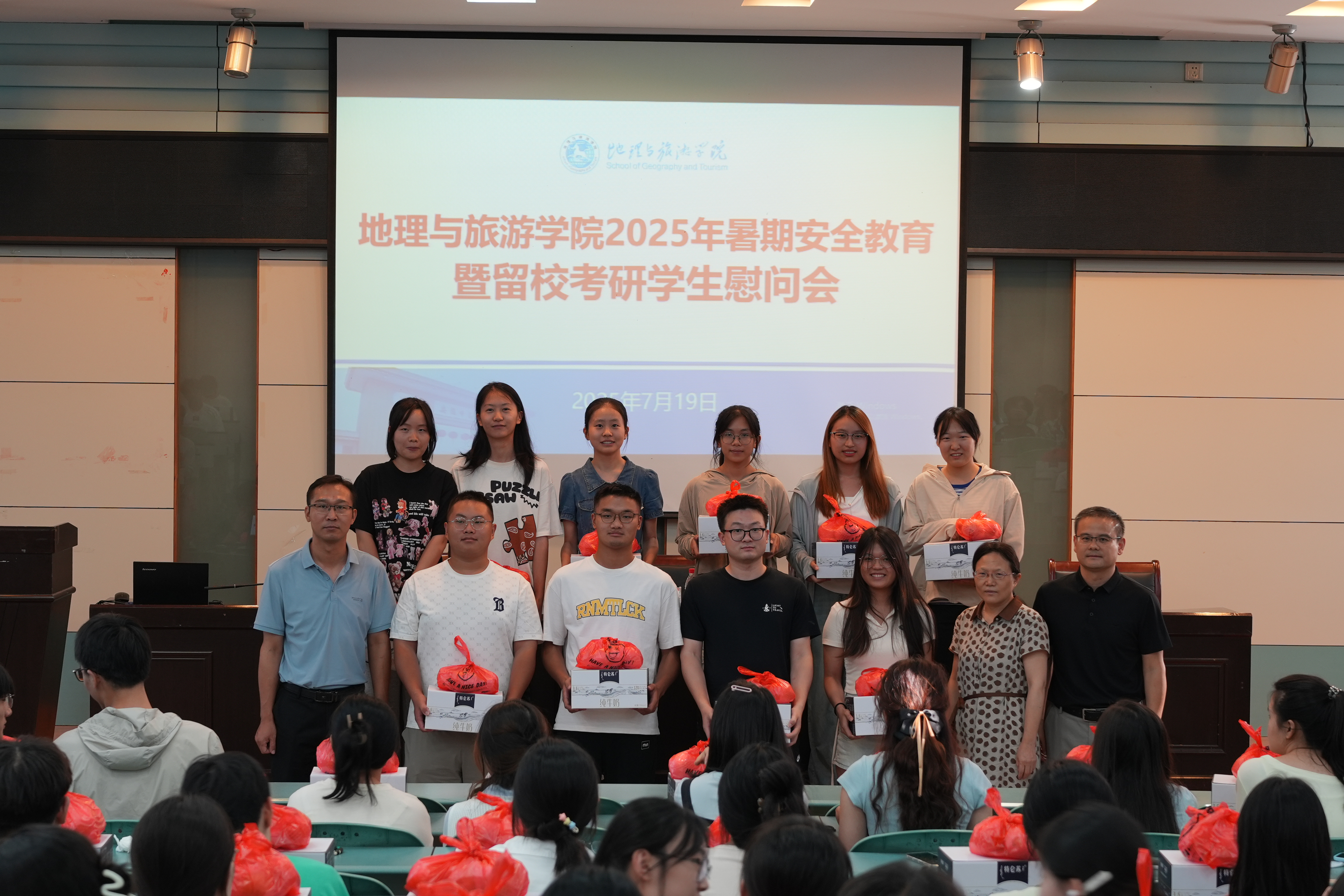 会议最后,学院领导和老师为考研和竞赛集训留校学生发放了牛奶、水果等慰问品。