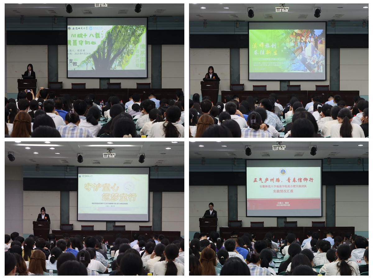 为全面总结2025年“行走的思政课”大学生暑期“三下乡”社会实践成果,生动展示各课程团队的实践成效与育人实效,进一步深化实践育人品牌内涵,9月24日下午,地旅学院在实验楼101报告厅举行暑期社会实践专题评比汇报会。学院党委副书记付勇、地理科学(师范)专业教师苗雨青、旅游管理专业教师王咏、土地资源管理专业教师董婷、地理信息科学专业教师季青、城乡规划专业教师朱玮林、学院团委以及各专兼职辅导员代表担任本次会议评委,实践团队队员、各年级学生代表观摩学习。