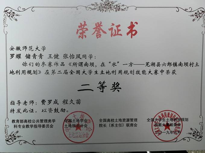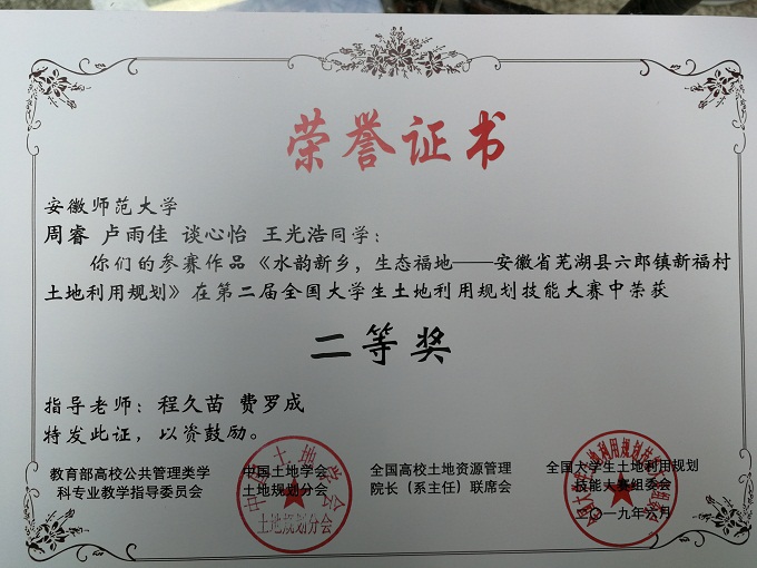 两支队伍均由必赢官网程久苗、费罗成两位老师指导。参赛作品《水韵新乡,生态福地:六郎镇新福村土地利用规划》(周睿、王光浩、卢雨佳、谈心怡),以及《所谓南坝,在“水”一方:六郎镇南坝村土地利用规划》(罗耀、储青青、张怡凤、王健),自今年报名以来,我们历时数月,利用课余时间学习规划编制基础技能,亲赴实地调查研究,完成了六郎镇新福村和六郎镇南坝村方案。两份作品在全国400余份作品参加的初赛中脱颖而出,经过层层选拔,最终同武汉大学、南京大学、四川大学、中国矿业大学等56所本科高校挺进全国总决赛,并均在总决赛中获全国二等奖。