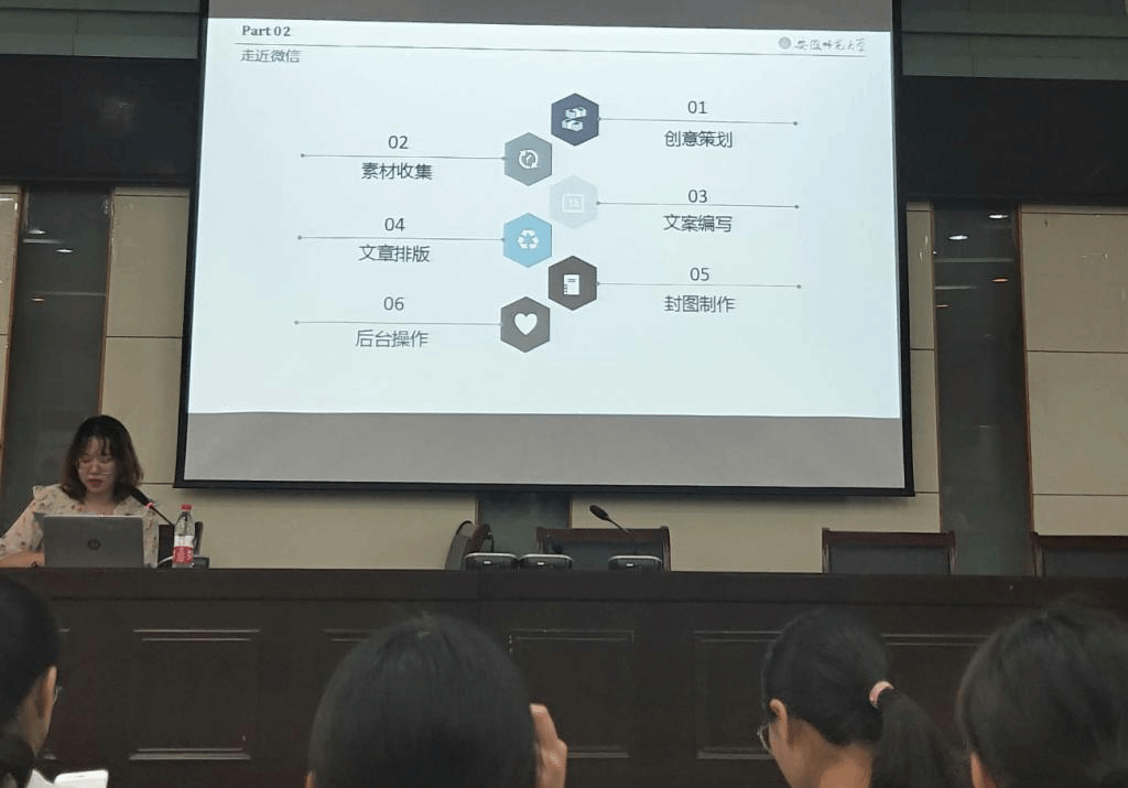 院团委书记吴辉和校全媒体中心新媒体工作室主席岳晓婧、副主席李英姿对学员进行宣传工作培训。吴辉结合新闻稿初稿与终稿,讲授了撰写校园新闻稿件的技巧和方法。岳晓婧和李英姿则在微信推文创作方面结合自身工作经历向学员传授工作经验。此外,还向学员推荐优秀公众号,鼓励学员们多思考、多创新。