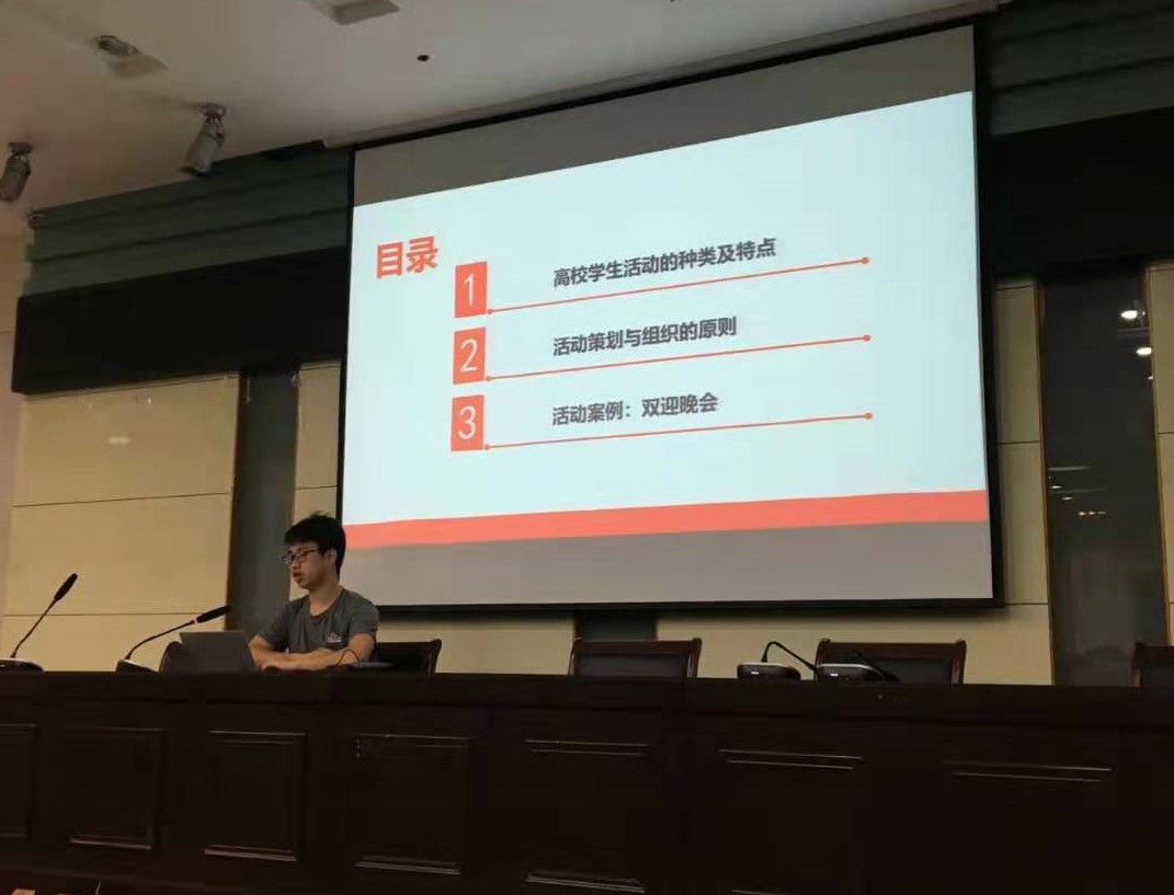 院团委书记吴辉作了题为《晚会的诞生——大型活动策划与组织》的讲座,以学院“双迎”晚会为例,从前期策划准备到设备与人员的安排,再到结束活动场地整理,向学员介绍如何对大型活动进行策划与组织。