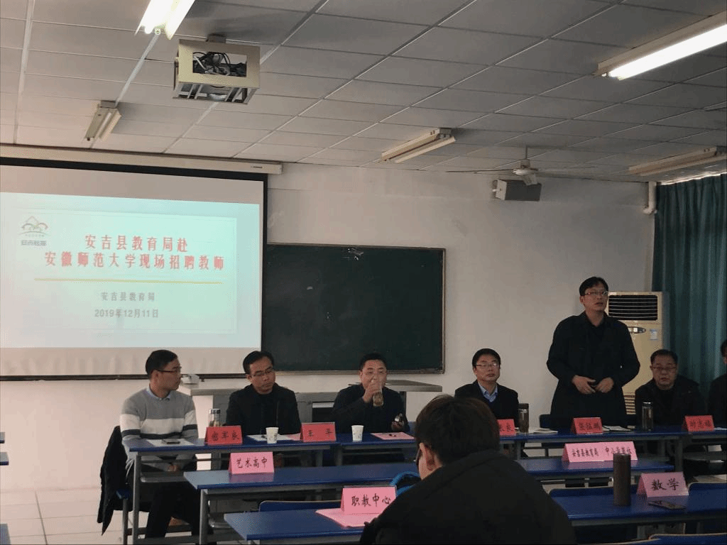 11日下午2:00,在地旅学院实验楼203教室进行校园宣讲,安吉县教育局组织人事科密良军就安吉县教育局以及各中小学、高职院校发展与人才需求做简要讲解,各学校校长分别介绍了校园文化,重点强调了招聘方式。针对学生提出的问题,各学校校长也做出了详细解答。宣讲结束后,到场的同学纷纷投递了个人简历,各学校分教室进行单独面试与试讲环节。12日上午,安吉县教育局各学校在203教室进行了签约仪式。