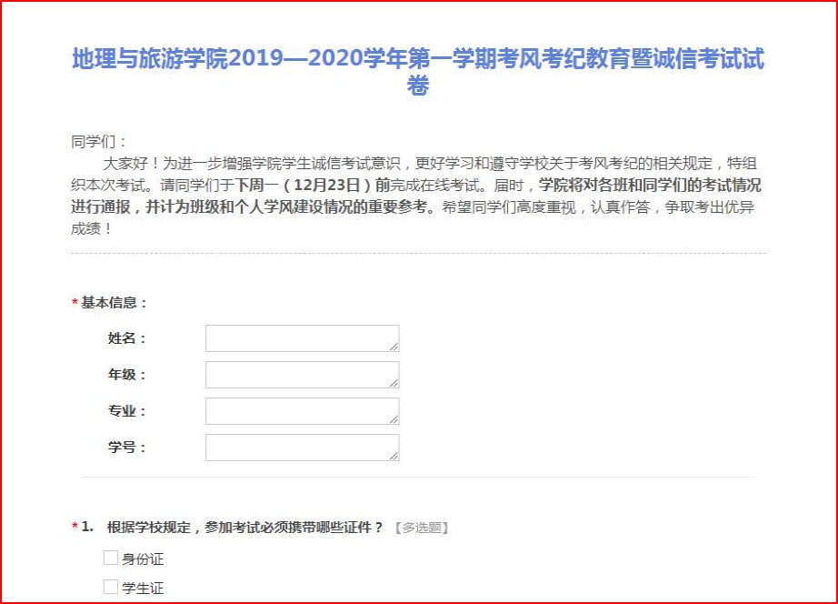 本网讯(地旅学院 齐小学)为进一步加强学风考风建设,强化学生诚信考试意识。自12月17日起,必赢76net线路官网结合实施学院“考八条”制度,以诚信考试学习资料、诚信考试在线测试等举措推进期末本科生考风考纪教育。