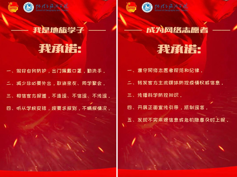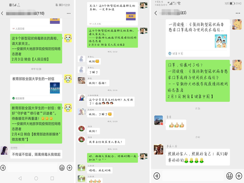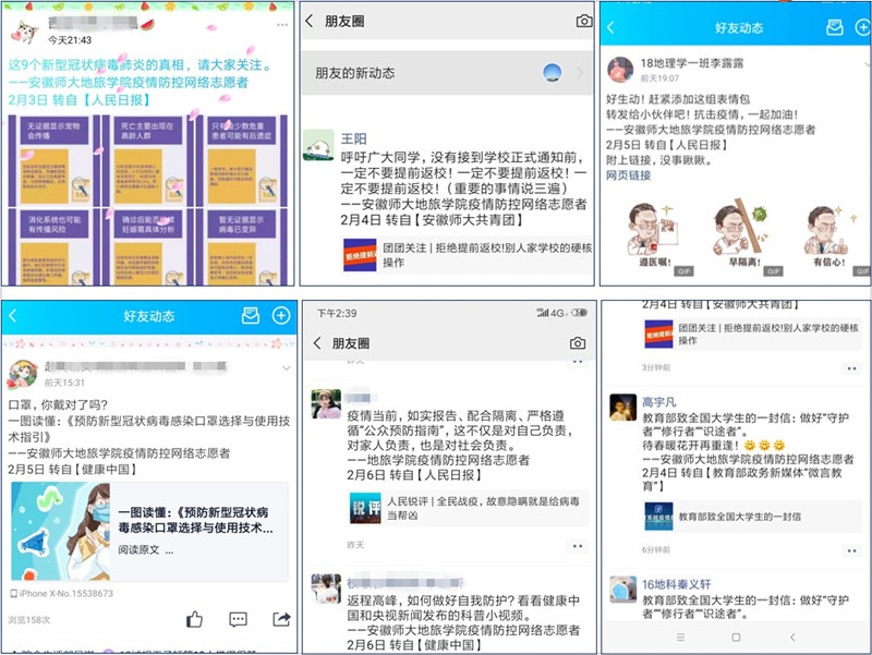 地旅学院旅游本科生党支部书记、院团委书记陈祥云介绍:“我们要求志愿者们统一转发的信息,在选择时一定是慎之又慎。并且,为了体现内容规范性和可靠性,每条统一转发的信息都由我本人确定和发布,并要求志愿者按照统一格式配文,注明信息来源,亮明疫情防控网络志愿者身份。志愿者们也都积极响应、严格执行。‘规定动作’一定要做到‘有模有样’!”