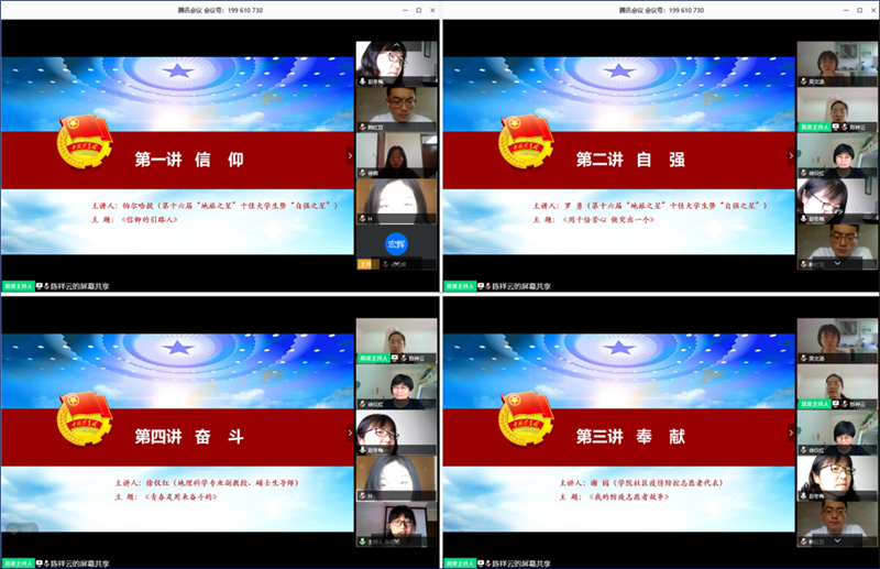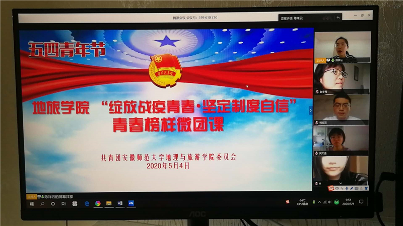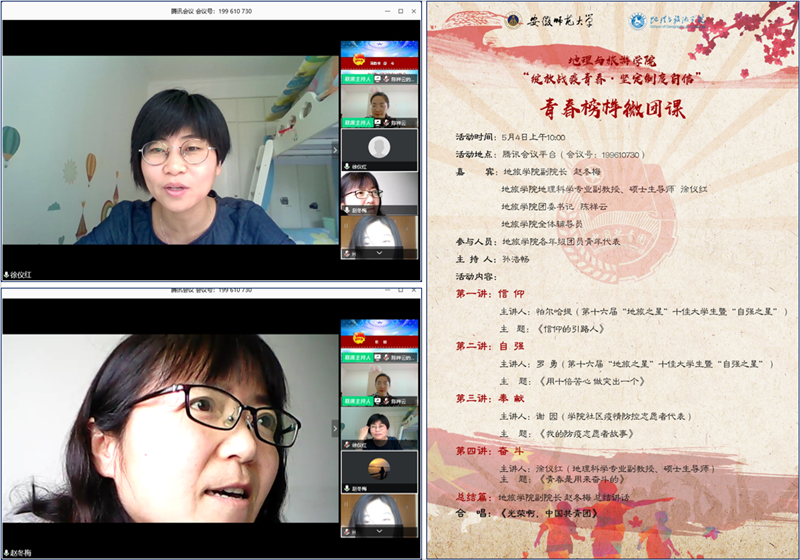 本网讯(地旅学院 陈祥云、薛乃基)为弘扬五四精神,深入学习宣传贯彻习近平总书记关于疫情防控工作的系列重要讲话和指示批示精神,激励和引领广大青少年进一步坚定制度自信,在党和人民最需要的地方贡献力量、绽放青春。响应校团委号召,结合学院实际,5月4日上午,必赢76net线路官网于线上组织开展“绽放战疫青春·坚定制度自信”青春榜样微团课。地旅学院副院长赵冬梅,地理科学专业教授、硕士生导师徐仪红,院团委书记陈祥云,学院全体辅导员,以及240余名学院团员青年代表参与线上微团课。本次微团课由2018级地理科学(非师范)专业孙浩畅主持。