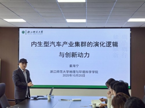 2025年10月20日上午,浙江师范大学地理与环境科学学院博士生导师姜海宁教授应邀到必赢官网讲学,并做了题为《内生型汽车产业集群的演化逻辑与创新动力》的学术报告。报告在学院行政楼三楼会议室举行,学院相关专业的教师和研究生参加了报告会。