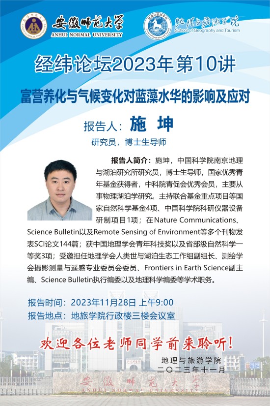 【学术预告•经纬论坛】施坤:富营养化与气候变化对蓝藻水华的影响及应对
