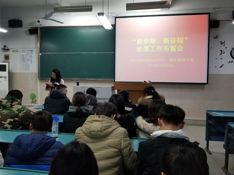 本网讯(尹琦蕾 高向文 彭媛媛)2月24日安徽师范大学2017级地理信息科学及城乡规划专业“新学期,新征程”主题班会暨班委工作布置会在行知楼召开,会议由辅导员彭媛媛主持。
