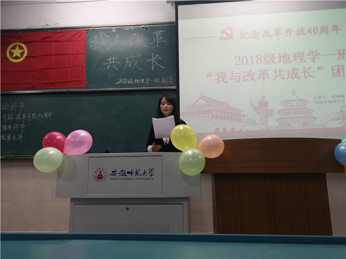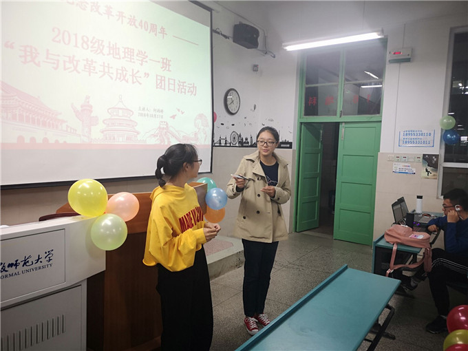 本网讯(地旅学院 金驰 百世杰)我国实行改革开放至今已有四十年,为让青年学生牢记这一伟大改革以及自身使命。2018年10月17日晚必赢76net线路官网2018级地理学一班于2040204教室举办了“我与改革共成长”主题团日活动。由地理学一班的团支书何雨婷主持,2018级地理学一班辅导员王阳及全体同学参与。