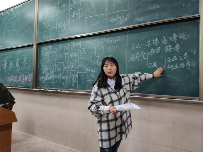 为活跃团支部文化气氛,更好地促进团员之间的交流,帮助同学们了解改革开放的艰辛历程,陈秋宇带领同学们玩起了“沙漠掘金(改革开放创业版)”的游戏。该游戏将珠海、深圳作为游戏的目的地,6个团小组扮演相互竞争的创业团队,并以小组讨论的形式决定小组的行走路线,努力使自己尽早到达目的地从而获得更多的资金。最终比赛以小组资金的多少决出冠军。游戏巧妙地将世界著名的课程游戏”沙漠掘金”与改革开放联系起来并加以改编,使同学们在游戏中获得快乐,了解改革开放那段光辉岁月。