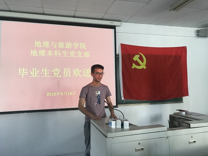 欢送会上,吴辉对2014级毕业生党员表达了真挚祝福和殷切期盼,低年级党员依次上台发言,回忆和学长学姐曾经一起学习、工作的点点滴滴。2016级地理科学专业的帕尔哈提·图尔荪说:“还记得第一次告别家乡来到师大,坐了几天几夜的火车,下车时已是凌晨三点钟,穆萨艾力学长早已守候在车站接我到学校,心中倍感温暖。现在,他要毕业了,我祝他前程似锦、健康幸福。” 2014级地理科学专业的黄靖已经保送至北京师范大学攻读硕士研究生,他不禁感慨:“这次活动使我倍感温暖,大学是我们每个人成就梦想的地方,每个来到这里的人都不应该忘记自己最初的梦想,我们应该带着自己最初的信仰和梦想扬帆远航。”