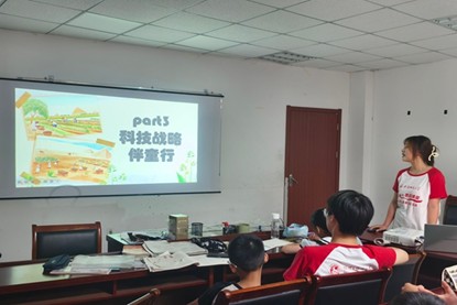为响应国家乡村振兴战略,践行新时代青年服务社会的使命担当,安徽师范大学地理与旅游学院赴芜湖弋江区马塘新镇“童心圆”支教宣讲团队于2025年7月6日深入芜湖弋江区马塘新镇元山社区,开展以“古今‘粮’缘”为主题的特色支教活动。团队以粮食文化为脉络,设计农耕知识讲解、作物盆栽实践、菜系地理解析等多维度课程,通过 PPT 演示、手工创作、音乐互动等形式,带学生们在识粮、惜粮、赞粮的沉浸式体验中,感受粮食文明的千年传承,让家国情怀在趣味课堂中自然生长。