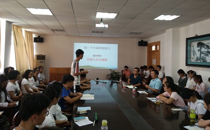 本网讯(国旅学院 张玉鑫)为强化2017级旅游管理新生专业思想教育,9月17日上午十点半,安徽省旅游学会副秘书长、安徽省旅游协会自驾游与露营分会常务副会长、安徽省旅游局“2016安徽旅游十佳微博”博主(杨子行游)、旅游营销实战专家、安徽旅游在线总编辑杨少武应邀在院行政楼三楼会议室举行2017级旅游管理新生专业思想教育专场报告,报告由旅游管理专业负责人杨效忠教授主持,专业老师王群教授和辅导员王美也参加了报告。