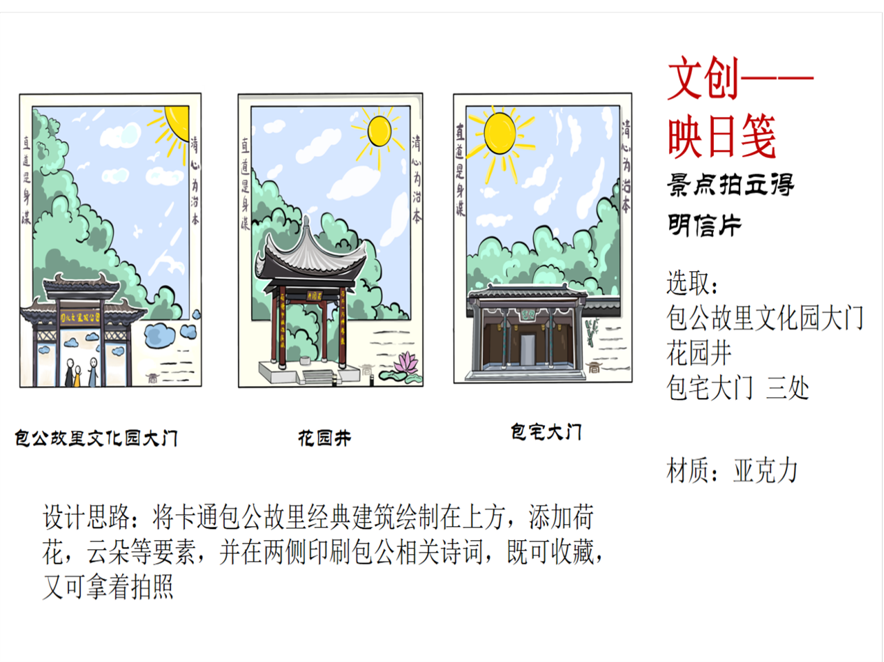 结合考察成果,团队构思了系列文创产品方案:“青莲生”系列以碗莲种植套装为载体,让游客在种植中感受参与乐趣;“青天正气”系列用“青莲”“云朵”“直竹”等意象,通过“器物隐喻精神”,设计兼具实用性与艺术性的冰箱贴和金属徽章等;“映日笺”系列将文化园标志性建筑与包公诗词相结合,开发具有纪念意义的打卡明信片和拍照工具;“钥见清廉”系列采用古籍残页的设计外观,以竹、莲、穗象征直、廉、仁三种精神,制作出赋有古诗词的钥匙扣;推出“包公形象”主题互动盲盒,融入历史典故,增强趣味性和教育性。