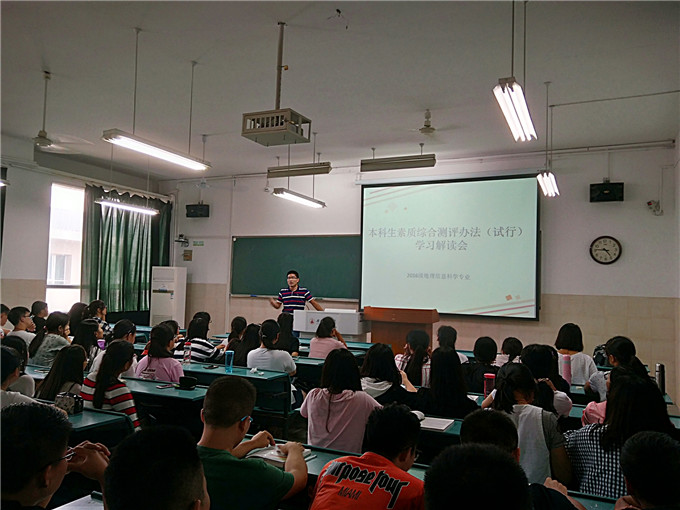 本网讯(国旅学院 周思雨)秋光灿烂幸福长,求知路途征帆扬。为贯彻教育方针,促进学生全面发展并以饱满的精神迎接新学期的到来。9月4号下午4点,2016级地理信息科学专业于教学楼2040501召开本科生素质综合测评办法(试行)及安徽师范大学对于《普通高等学校学生管理规定》(教育部41号令)实施办法的学习解读会。