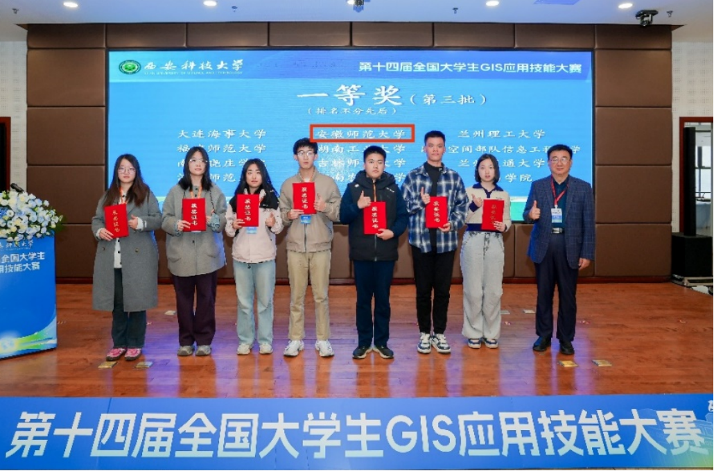 2025年11月16日,从第十四届全国大学生GIS应用技能大赛现场传来喜讯,由我校必赢76net线路官网汪左、宋立生老师指导,地理信息科学专业2023级本科生孙慧文、陈子璇、朱睿文、宋明谕四位同学组成的参赛团队,凭借扎实的专业基础、出色的技术应用能力和稳定的赛场发挥,一举夺得大赛一等奖,充分展现了我校学子在GIS领域的卓越专业素养与创新实践能力。