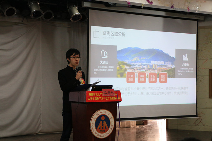 在参赛过程中,国旅学院的参赛选手积极备战,在PPT汇报环节和现场答辩中,表现不俗。充分展现出了国旅学院子勇于创新、敢于挑战的青春风采。14级旅游管理梁宜人同学的《连片特困区旅游精准扶贫新模式:廊道扶贫——以大别山贫困区核心区域安徽省六安市为例》,以旅游扶贫为切入点,分析了廊道扶贫模式对于连片贫困区的科学有利之处。14级旅游管理胡程等同学的《美丽乡村+旅游的融合发展路径研究――以滁州环城美丽乡村示范带为例》,依据滁州的特殊地理位置和自然条件,提出了以美丽乡村建设吸引旅游发展的创新性路径模式;14地理科学温庆志等同学的《基于多源数据的淮河流域干旱监测模型构建及应用》利用空间监测系统和数据模型,对于对淮河流域一段时期内的干旱情况进行实时性监测。14级地理信息科学张海琴等同学的《城市生活服务小贴士》用创新的视角和方法为现代城市居民出行和生活方式提供了诸多小窍门。