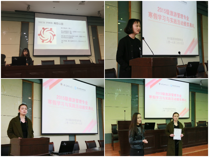 本网讯(国旅学院 韩静茹近日2015级旅游管理专业在国旅实验楼召开青春导航系列主题班会暨寒假实践活动颁奖典礼,总结寒假期间全体旅游专业学子的各项学习实践成果,表彰各类活动表现优异的同学们。通过此种典型表彰形式,激励同学在新的学期,追求更优秀的自己,打造更优秀的大学生活。