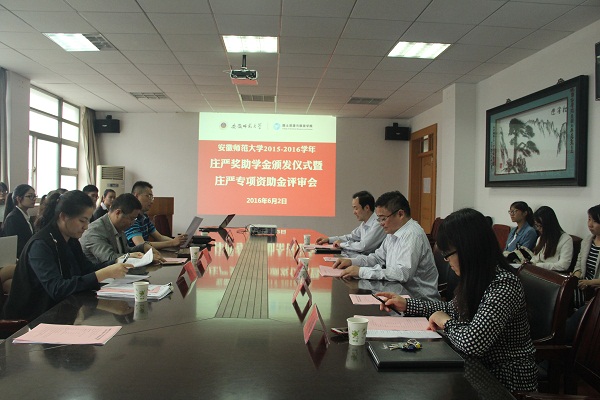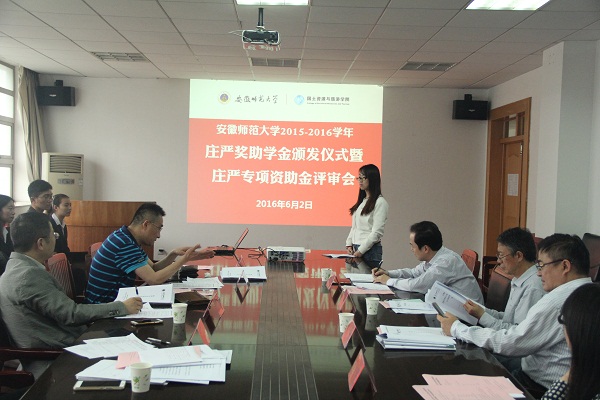 本网讯(国旅学院 吴燕/魏晓雯)6月2日下午,安徽师范大学2015-2016学年庄严奖助学金颁发仪式暨庄严专项资助金评审会在国土资源与旅游学院行政楼三楼会议室举行。庄严基金会评审委员会委员吴斌、吴军,秘书长杨晶晶,国旅学院党委书记贾冠忠、院长苏勤、党委副书记乔静、副院长赵冬梅出席本次会议,全体专兼职辅导员、奖助学金受助学生代表及专项基金申报团队参加了会议,会议由乔静主持。