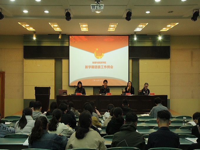 本网讯(地旅学院 查煜)3月20日下午,地理与旅游学院团委工作例会在地旅实验楼101报告厅顺利召开。会议由院团委书记吴辉主持,院团委副书记陈祥云、彭媛媛、鲍晓楠,团委委员及各班团支书参加本次会议。