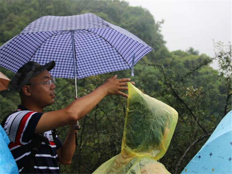 队员们经过中午的休息,终于在下午和雨中的丹霞来了次亲密接触。虽然是和上午相同的进山路程,但是因为雨天道路湿滑,队员们的脚步放得愈加慢了。随着山路变窄,雨具也从雨伞换成了雨衣。雨水混杂着汗水湿透了队员们的队服和头发,又顺着发梢滴落,混进丹霞的雨里,砸进湿漉漉的台阶上。
