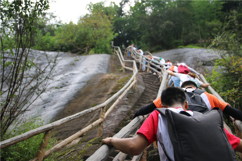 丹霞山地貌素有“顶平、坡陡、麓缓”的特点。云崖栈道便是修筑在阳元山悬崖峭壁上的登山栈道。栈道一面紧贴阳元山那些千万年前的沉积物,一面凌空,脚下便是深渊。据带队的吴立老师介绍,云崖栈道之险可以与野长城媲美。行至窄处,仅容一人侧身通过;行至陡处,栈道则近乎垂直。好在谷间清风送凉,丹霞山体蔽日。队员们相互调侃着,鼓励着,向高处不断攀登。