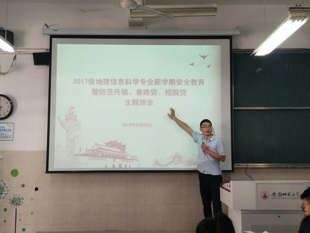 本网讯(地旅学院 章莹莹)为严防传销非法活动进入校园,维护校园的安全稳定,提高学生的辨别能力,保护学生的身心安全和财产安全,2017级地理信息科学专业于929日上午在行知楼2040303组织召开了新学期安全教育暨防范传销、“套路贷”、“校园贷”主题班会。会议由辅导员韩红豆主持,班级全体同学参与。