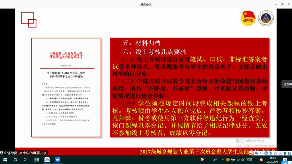 会议主要分为三个部分。首先,齐小学带领同学们学习了《关于做好2019-2020学年第二学期本科课程期末考核工作的通知》文件精神。他强调,因新冠肺炎疫情影响,本学期课程考核采用线上方式进行。课程考核由教务处统筹、开课学院具体实施,非毕业班年级本科生的考核除纳入推荐免试研究生范围的缓考课程外其余课程采用线上考核的方式。同时,为保证线上考核的公平合理性,学院将采用强化线上考核过程与课程考核贯穿教学全过程的措施。此外,他还对考试设备要求、考生考核要求等进行具体讲解,建议同学们认真准备、全力备考。