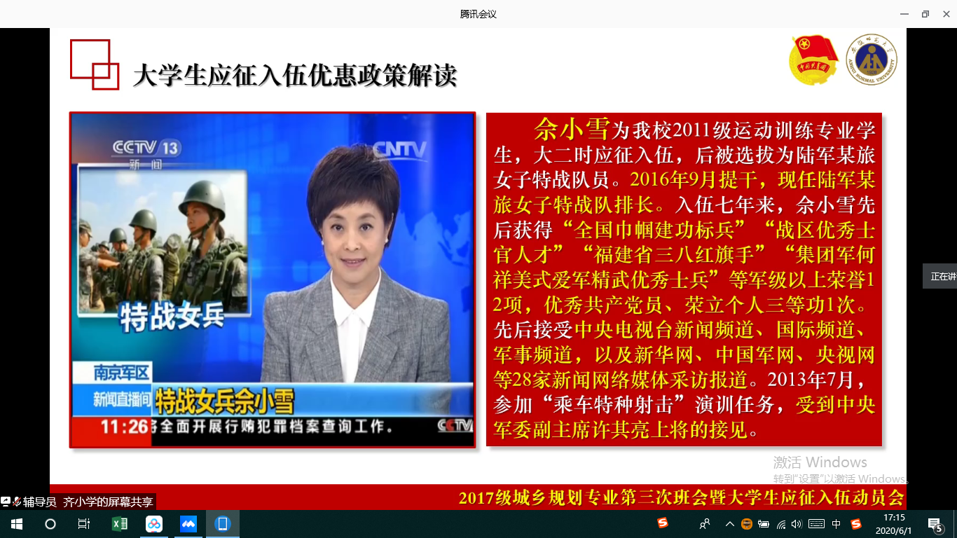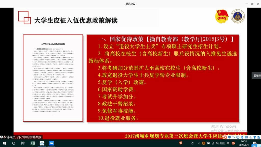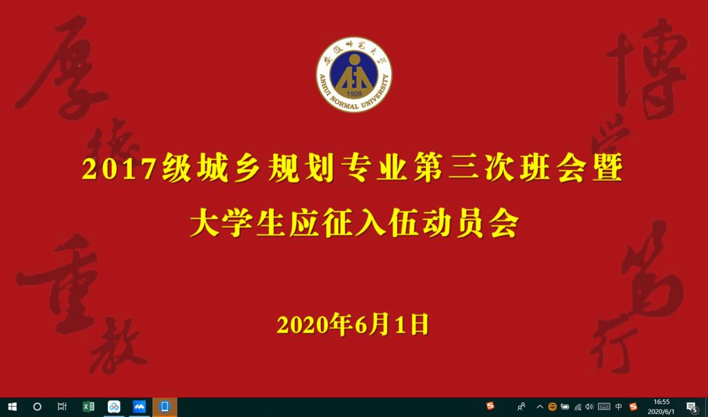 本网讯(地旅学院 张鑫 齐小学)6月1日下午,2017级城乡规划专业在腾讯会议举行2019-2020学年第二学期第三次班会暨大学生应征入伍动员会,班级全体同学参加会议。会议由辅导员齐小学主持。