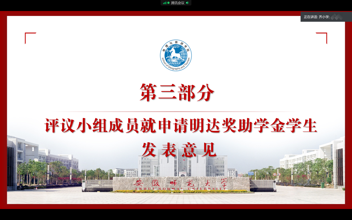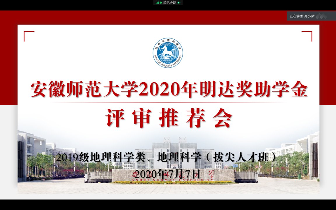 本网讯(地旅学院 齐小学)7月7日晚,2019级地理科学类1班、2班和2019级地理科学(拔尖人才班)利用腾讯会议网络平台,顺利召开明达奖助学金评审推荐会,各班级评议小组全体成员参加会议。会议由评议小组组长、辅导员齐小学主持。