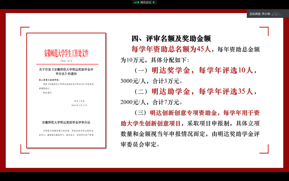 首先,齐小学就带领评议小组全体成员认真学习了《安徽师范大学明达奖助学金评审办法》。他强调,明达奖助学金是深圳明达资产管理有限公司为积极支持教育事业的发展,资助在读本科生顺利完成学业,激励其勤奋学习、励志成才而在安徽师范大学设立的社会奖助学金。自2016年设立以来以成功评选过4届,共资助了140名学生。对此,在评选过程中一定要严格标准、公平公正、认真细致,推选出最佳人选供评审委员会审核、确认,切实发挥出明达奖助学金资助育人、培优助困的积极作用。