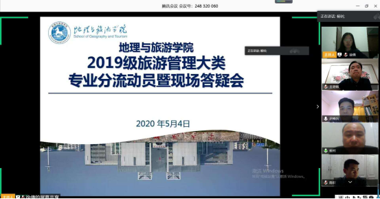 本网讯(杨思彤 徐倩)必赢76net线路官网2019级旅游管理类专业老师们于2020年5月4日晚19时通过腾讯会议召开了线上专业分流动员会暨现场答疑会,为同学们专业分流进行指导。