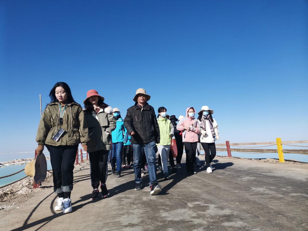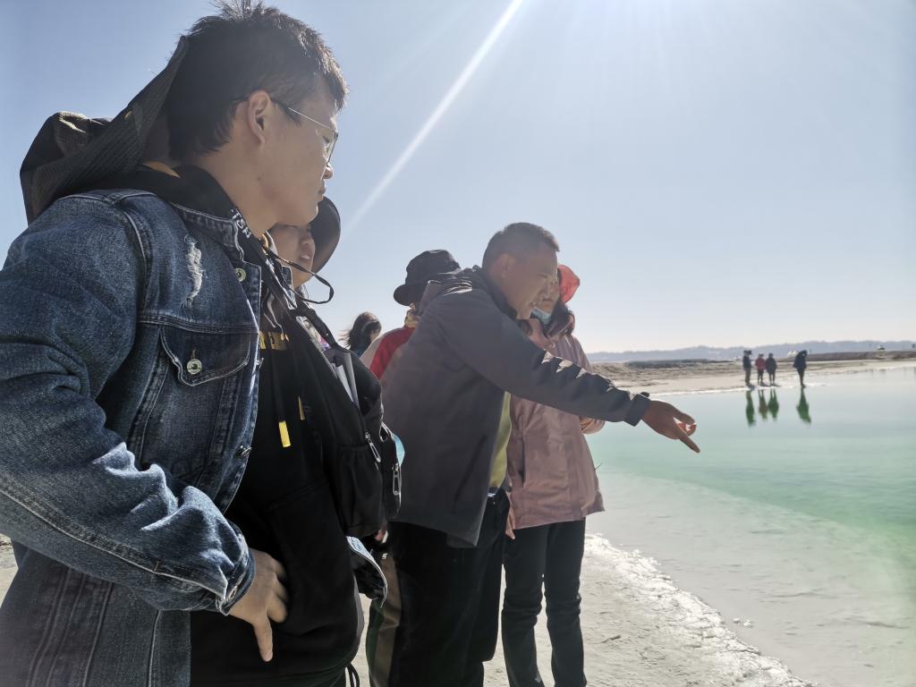 10月16日上午10时,团队全体成员在带队老师的带领下顺利抵达目的地——亚洲第一大盐湖、世界第二大盐湖察尔汗。在行进途中,程先富事先为同学们讲解了有关察尔汗盐湖的专业知识,为实地考察做好铺垫。察尔汗的蒙语语义是盐中之王,是中国第一大盐湖。在察尔汗大盐湖,有一花一业一奇景。“花”指盐湖中生长的形态各异的盐结晶——盐花。同学们向程先富请教有关盐湖色彩和盐花的成因并积极讨论。盐湖湖水色彩多变,盐水色彩主要由水体混浊度和气压等因素综合影响。风起时,水面气压降低,离子溶解度变大,水会变得更绿。“业”指工业,察尔汗是中国最大的工业盐产区,盛产钾肥,观光车驶在的公路长32公里,是一座浮在卤水上的“万丈盐桥”。80年代,采盐船的技术被国外掌控,但中国人民通过不懈努力研究出了更高效的技术,打破了外国的垄断。年复一年,盐湖人民辛勤劳动,为中国的采盐事业做出贡献,打造了这片土地特有的盐湖精神。察尔汗盐湖自然资源丰富,旅游观光价值显著,目前对盐湖的开发的只是冰山一角,为推动资源绿色可持续开发利用,促进盐湖的工业和旅游业健康发展,人们正朝着人与自然和谐共生的方向不断努力。