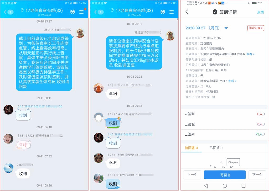 查寝过程中发现有部分同学用电行为不规范,如人走插排未断电等行为,韩红豆要求同学们务必提高安全用电意识,做到人走断电,严禁使用违规电器,规范用电行为,杜绝安全用电隐患。在寝室管理方面,班级使用今日校园进行每晚线上零点报告,并结合辅导员、班委随机抽查,便捷高效落实晚点名制度。同时,韩红豆提醒同学们要预防网络诈骗,提高安全意识,遇到问题第一时间向辅导员报告。