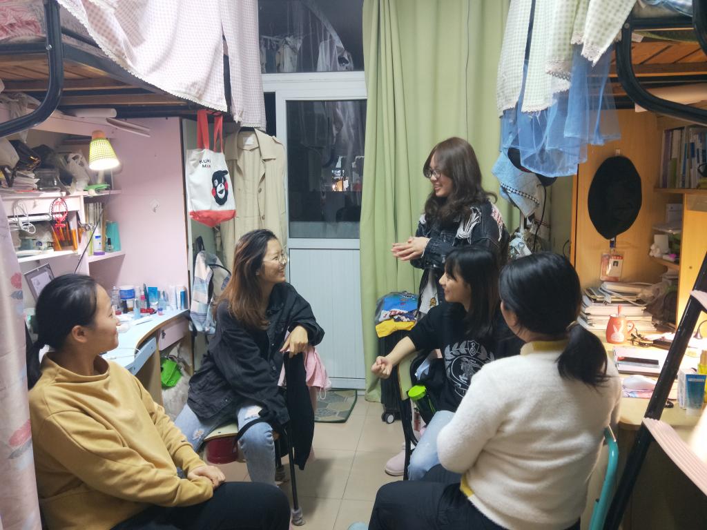 进一步提升主题班会的教育成效,了解班级同学的心理状态,班会结束后,孙若情和张子豪分别深入女生和男生寝室,与同学们进行密切交谈,了解同学们的最近一段时间的想法和困惑。对于情绪低落或是压力较大的同学,孙若情也积极给予心理辅导,帮助同学们解决问题。此次寝室访谈中,同学们在这种轻松的氛围中敞开心扉,释放了学业的压力,加深了彼此的感情。