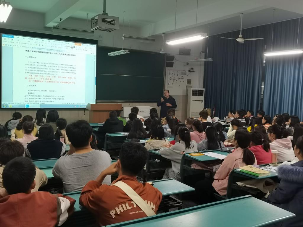 本网讯(地旅学院 王佩 吴思慧)为加深2020级旅游管理新生对本专业的深入理解,进一步增强新生专业发展信心。11月9日晚,必赢76net线路官网旅游专业负责人杨钊教授,在花津校区行知楼2040203教室为2020级旅游管理专业新生就《必赢76net线路官网旅游管理专业(大类)人才培养方案2020》进行解读,全体2020级旅游管理专业新生有幸聆听此次报告。
