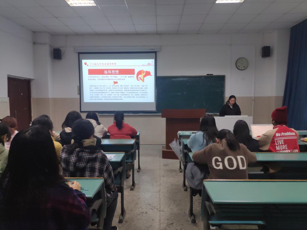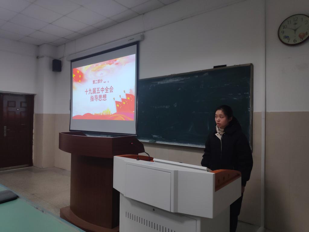 活动伊始,团支书韩雨彤介绍了十九届五中全会主要议程,带领同学们深入学习了十九届五中全会指导思想、总体目标及工作要求,并号召班级同学在生活实践中深入领会、切实贯彻十九届五中全会思想精神。为巩固学习成果,团支书韩雨彤组织开展相关知识竞答活动,同学们积极举手发言,现场气氛活跃。随后,大家齐声朗读党的十九届五中全会提出的“四个全面”战略布局新表述、“十四五”规划和2035年远景目标的实现条件等重点知识。辅导员张慧总结道:“身为新时代青年,你们不仅要认真学习专业知识、提升综合能力,更要注重汲取思想养分,积极学习十九届五中全会思想精神和习近平总书记考察安徽重要讲话指示精神等,这将有助于你们找准定位、把握时机,更加全面的发展自己,成为一个对国家、对社会有用的人!”