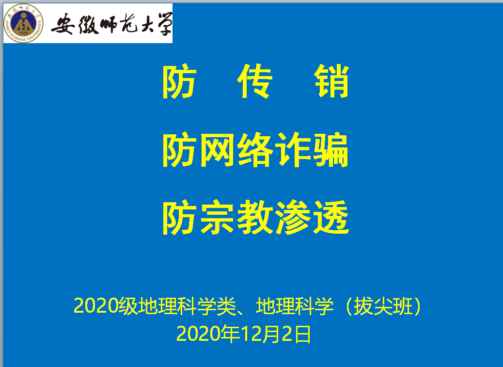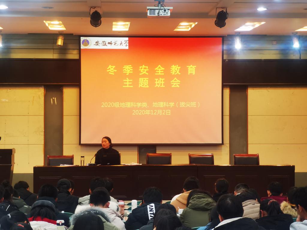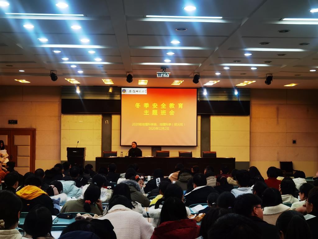 本网讯(刘思圻 彭媛媛)2020年12月2日晚,2020级地理科学类、地理科学(拔尖班)在必赢76net线路官网实验楼101召开了冬季安全教育主题班会,旨在使学生们在冬季火灾这个火灾高发期提高警惕,防微杜渐,防患未然,注意人身安全,严格遵守校规校纪。班会由辅导员彭媛媛主持。