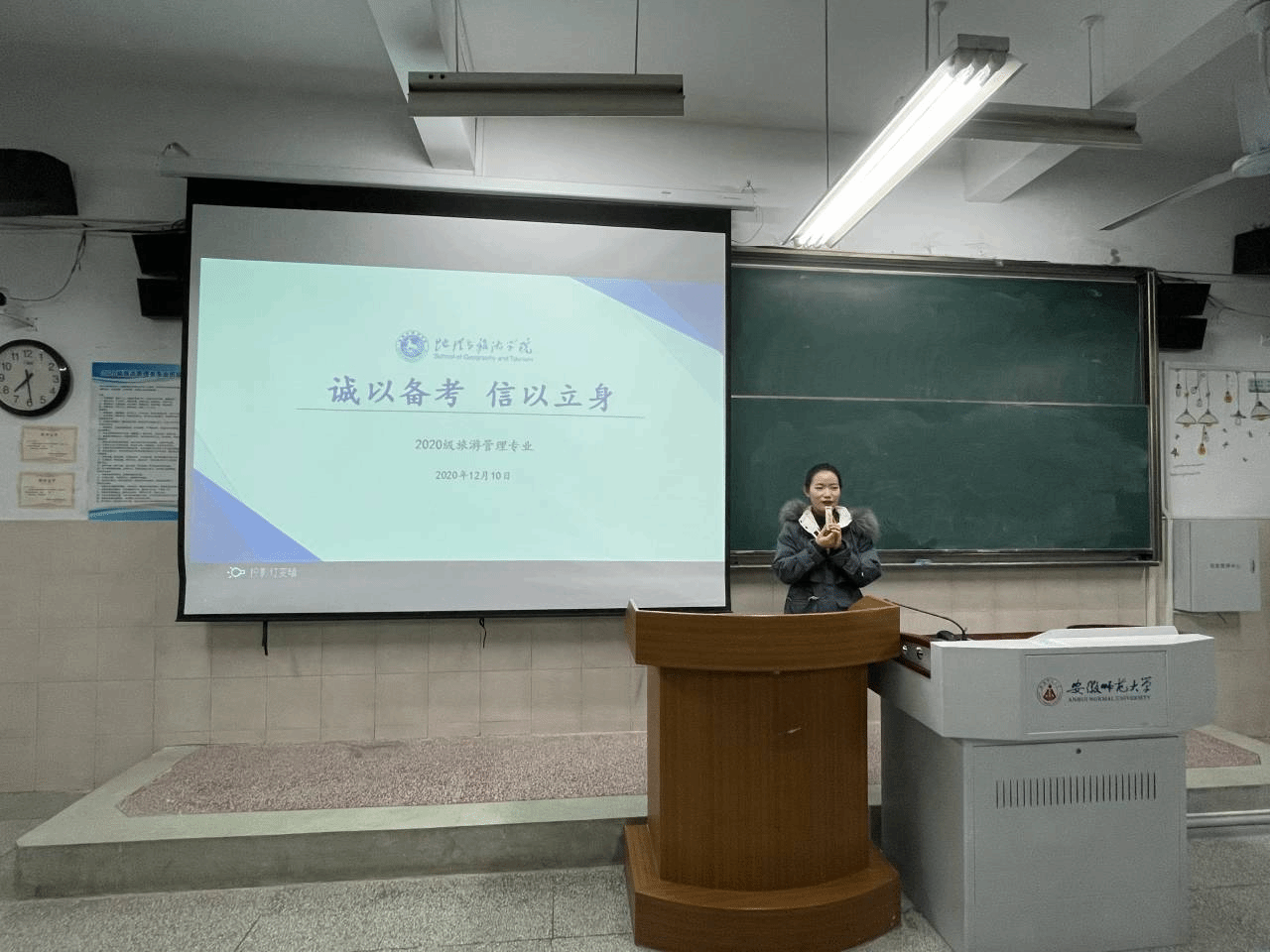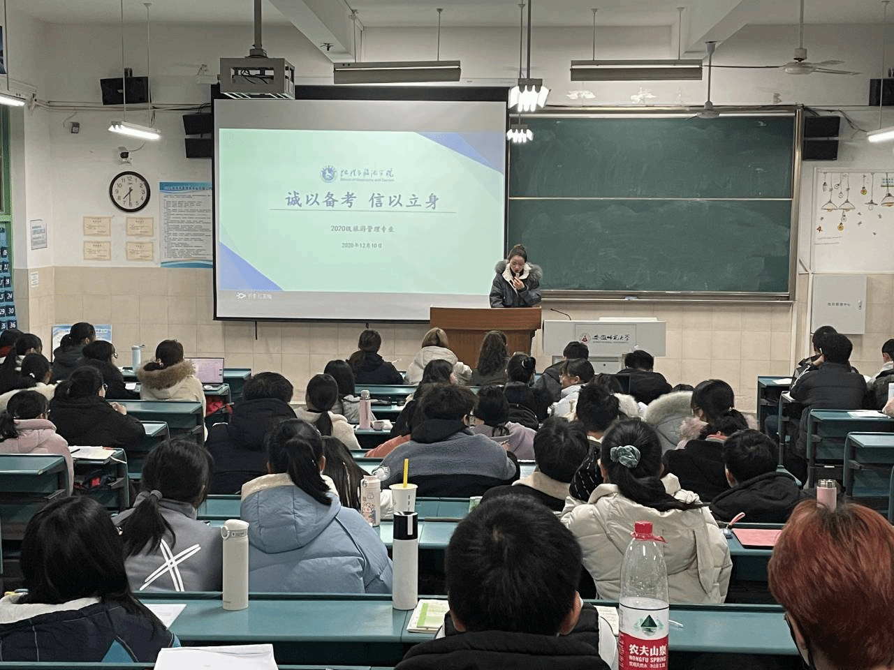本网讯(地旅学院 孙云峰 赵佳慧) 沐于知识,学于诚信。大学英语四、六级考试和期末考试临近,为使大一新生在四级英语考试和进入大学的第一次期末考试中能够端正学习态度,树立优良学风,严格考风考纪,12月10日晚七点, 2020级旅游管理专业在行知楼4号楼203教室召开“诚以备考,信以立身”主题班会。班会由辅导员赵佳慧主持,2020级旅游管理专业全体同学参与。