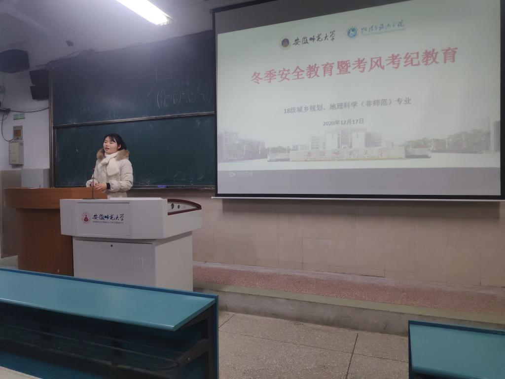 本网讯(地旅学院 李娜 张慧)强安全防范意识,营诚信考试氛围。2020年12月17日晚上七点,2018级地理科学(非师范)、2018级城乡规划专业冬季安全教育暨考风考纪教育主题班会在行知楼4号楼104教室顺利举行。班会由辅导员张慧主持。