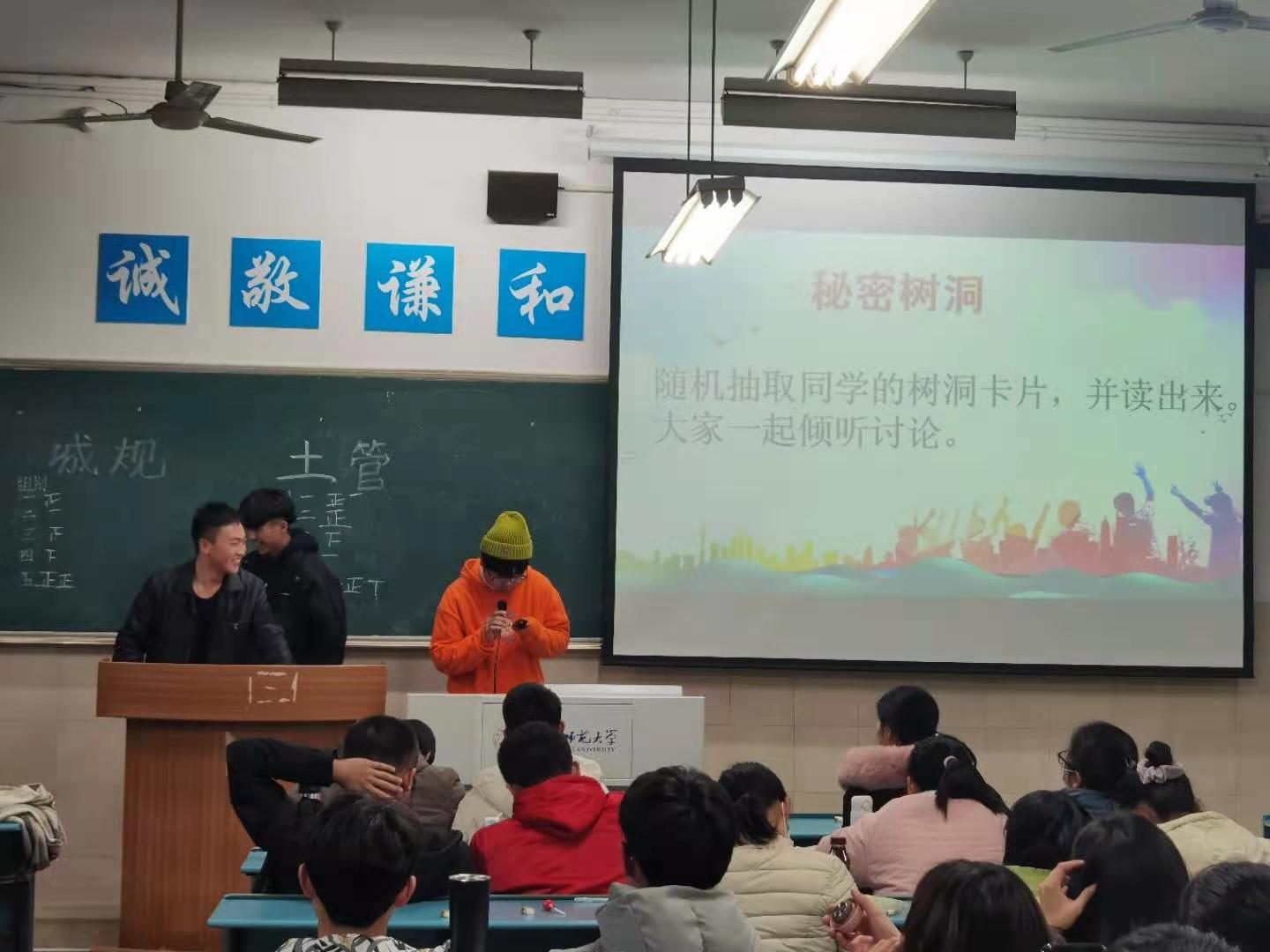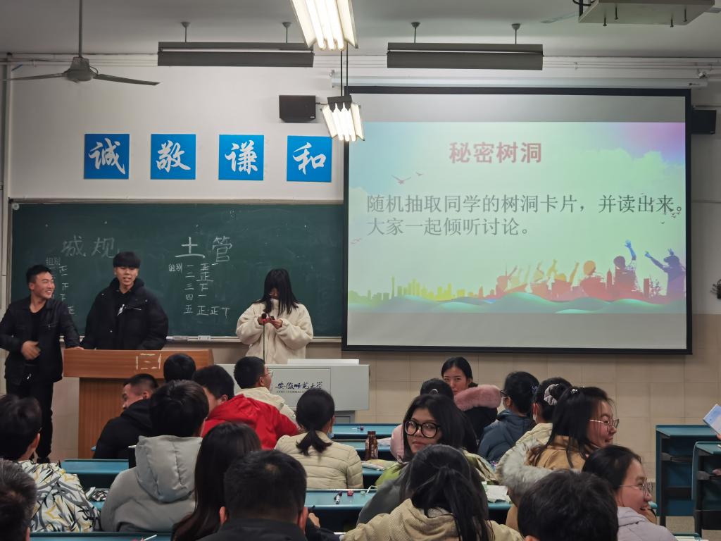 最后,主持人邀请几位同学随机抽选事先由全体同学书写好的小纸条并当场诵读,大家一同倾听。纸条上写满了同学们的真切心声:或分享了自己入校以来的所见所闻所感,或抒发了对大学生活的美好愿景,或表达了对辅导员刘少杰的感激之情。同学们在树洞中表达真情、在树洞中释放压力、在树洞中分享快乐。