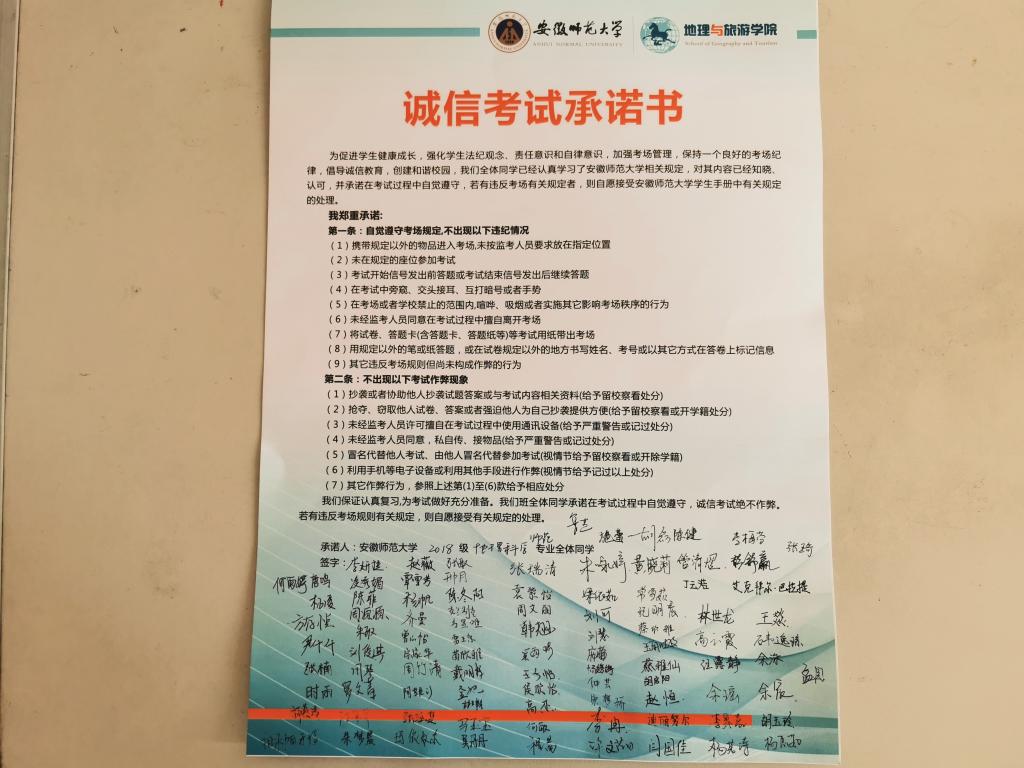 会议伊始,丁茹栩强调了考试作弊的严重后果,以往届学生作弊被抓案例和自己监考中发现的实际问题为切入口,提醒同学们遵守考试纪律,号召同学们做到诚信考试,营造良好的诚信考试氛围。与此同时,丁茹栩建议大家在最后的期末复习时间,劳逸结合、脚踏实地,诚信应考,以真实水平迎接期末考试,从根本上防范和杜绝作弊行为。此外,丁茹栩提醒同学们及时登录安徽师范大学教务系统查询考试的具体安排,不要出现记错考试时间,跑错考场的现象。会议最后,每个同学依次在诚信考试承诺书上签好了自己的姓名,并承诺在考试过程中自觉遵守考试纪律,绝不出现舞弊行为,若有任何违反考场规则的行为,自愿接受规定的处理。