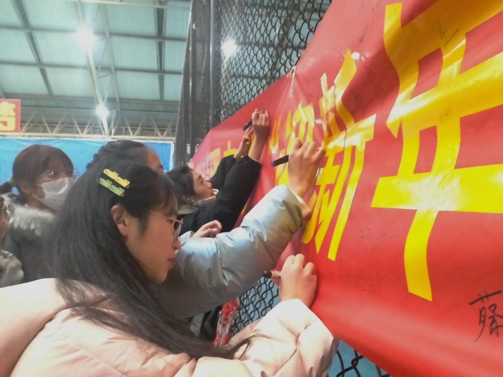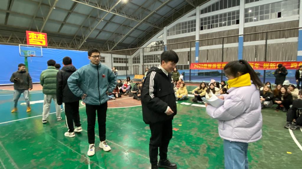 在接下来的游戏环节中,同学们积极主动参与,你画我猜、踩报纸、四人五足等游戏让同学们在愉快地氛围中也感受到了集体的美丽所在,现场气氛很是活跃。同学们踊跃参与游戏,获胜的小组得到了精心准备的纪念品。即兴表演环节中,徐菁、孙云峰、马育荣、张家旺、柳铭伟、余志平和吐尔洪阿义等同学纷纷用歌声为同学们送上新年祝福,其中,来自新疆的色热吉丁同学还用他的母语为同学们献歌一曲,现场气氛热烈,最后大家一起合唱班歌《飞云之下》。晚会结束之际,2020级旅游管理全体同学给学院的全体老师们录了跨年祝福视频,为此次晚会画上完美的句号。