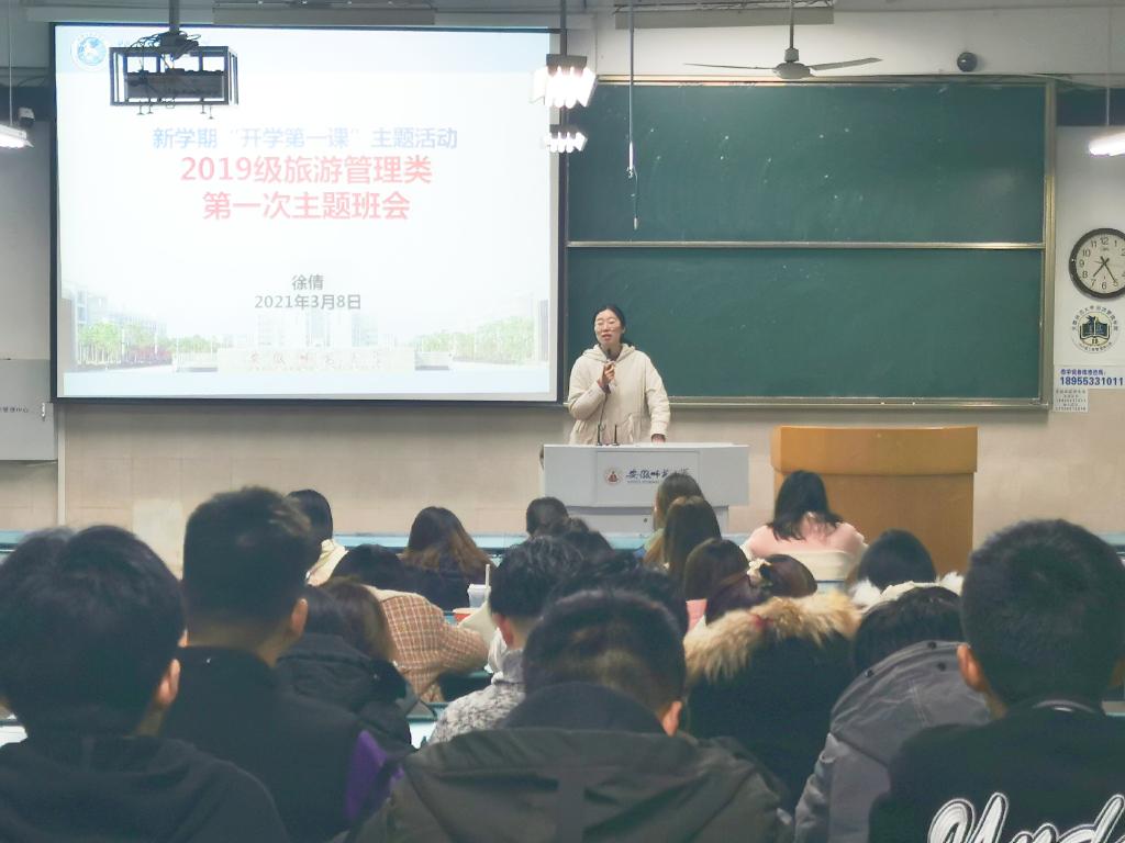 本网讯(19旅管 凡语馨 徐倩)阳春三月归校园,开学一课助成长。为了庆祝中国共产党成立100周年,积极响应学校的号召,进一步加强大学生思想政治教育,激发广大同学以饱满的精神、奋进的姿态投入新学期的学习和生活。2021年3月10日至12日期间,必赢76net线路官网2019级旅游管理大类专业组织开展了一堂思政课、劳动课、安全课、法制课、疫情防控课——“开学第一课”系列活动,辅导员徐倩老师及全体19级旅游管理大类同学参与活动。