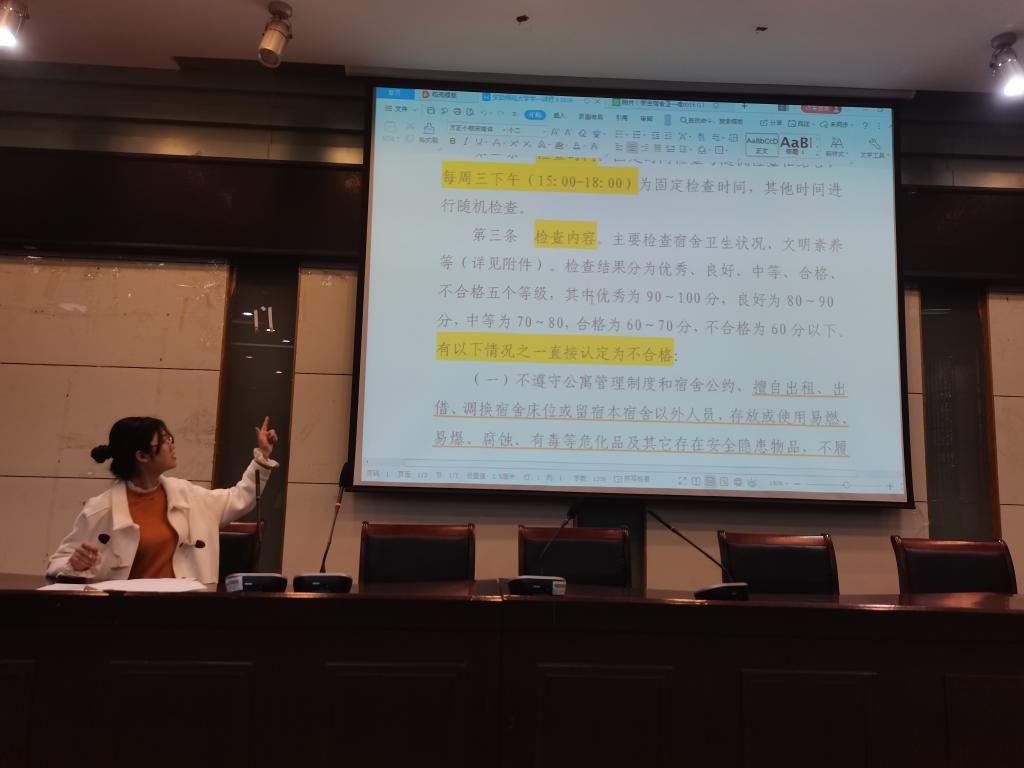 会议初始,丁茹栩为同学们解读了《安徽师范大学学生宿舍卫生文明检查实施办法》文件,主要分为检查时间和检查内容两个部分。丁茹栩提醒同学们在每周三下午三点到六点为固定检查时间,并要求同学们基本做到床上被褥叠放整齐,地面、桌面干净整洁,用电合理、安全,同时要注意礼仪礼貌在,展现良好地旅学子风采。
