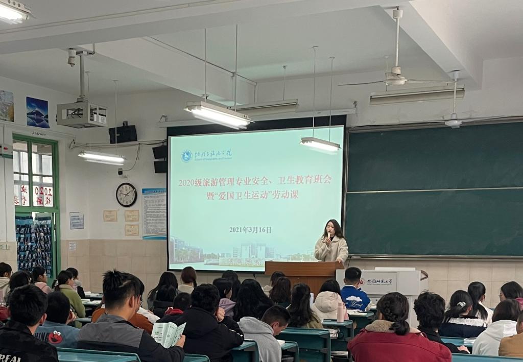 本网讯 (地旅学院 赵佳慧 孙云峰)为提高学生安全卫生意识,进一步推进文明宿舍建设和营造舒适健康的学习生活环境,2020级旅游管理专业辅导员赵佳慧于3月16日下午,在4号楼203教室召开了安全卫生教育主题班会暨“爱国卫生运动”劳动课。班会由赵佳慧主持,2020级全体旅游管理专业同学参加。