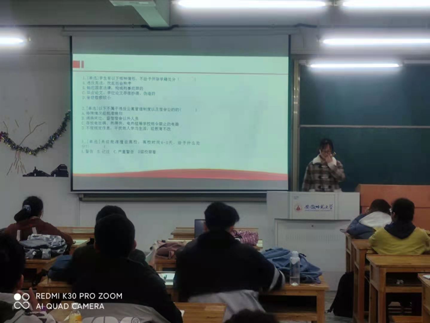 首先,徐嘉祺以提问的方式引出活动主题,通过精彩的案例以及学校对违纪同学的通报决定向各位同学强调了认真学习并严格遵守校规校纪的重要性。接着,徐嘉祺带领大家认真学习校规校级,并领读安徽师范大学学生管理“四项禁令”:严禁擅自离校、严禁私自租房、严禁晚归不归、严禁违规电器,通过竞答的方式对班级同学进行校规校级知识考核。最后,辅导员刘少杰通过讲述真实案例向大家再次强调认真学习并严格遵守国家法律法规和校规校级的必要性和重要性,并对每位同学提出要求:对于校规校级的学习不仅要内化于心,也要外化于行!
